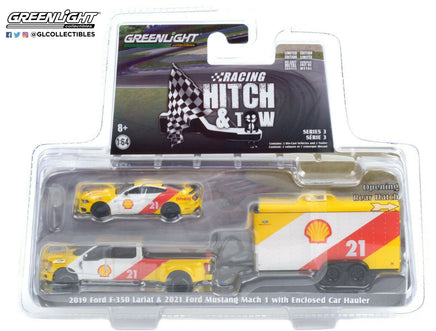 1:64 GreenLight *HITCH & TOW* SHELL 2019 Ford F350 Dually Mustang & TRAILER NIP