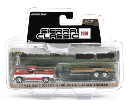1:64 GreenLight *HITCH & TOW* Red & White 1986 GMC Sierra & Flatbed Trailer NIP