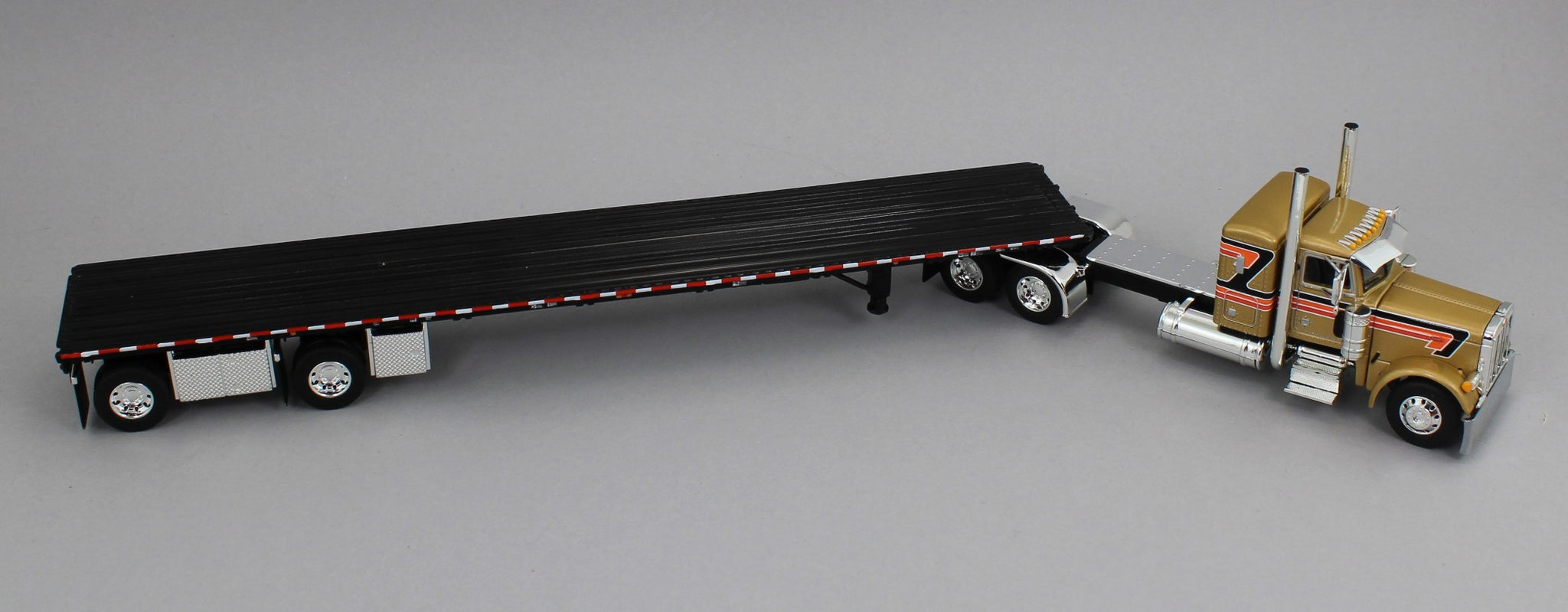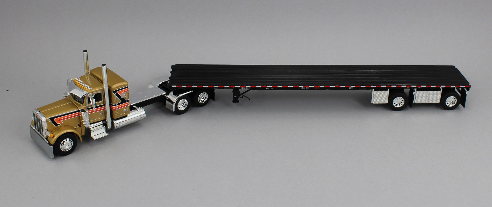 Gold Peterbilt 379 36" Flattop Sleeper & Spread-Axle Flatbed Trailer.
