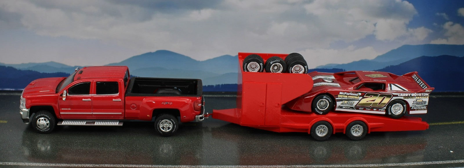 This is a Custom 3D printed, Reliable Welding "PARKER" Ramp Over Race Car Trailer for hauling 1:64 ADC Dirt Late Model Diecasts.